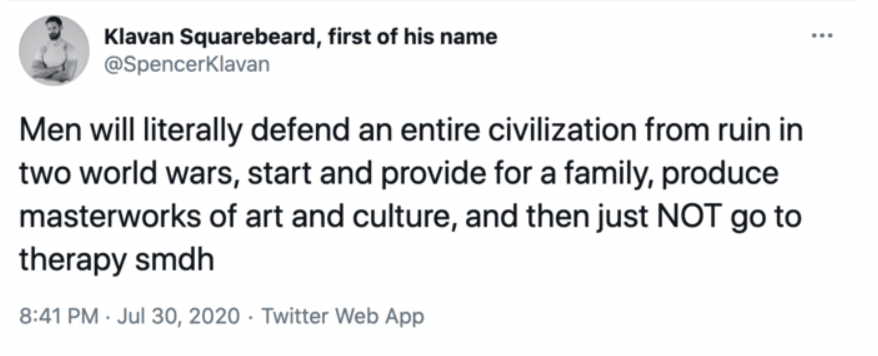 Men don’t want to go to therapy. Why would they? When the American Psychological Association declared traditional masculinity “harmful.” And the majority of therapist are women who graduated from woke institutions that want to smash the patriarchy. And how does sitting around talking about your problems help you become more powerful and successful? It doesn’t. The truth is most therapy is useless for men. You’re better off taking up Ju-Jitsu or hitting the gym, working out your emotions...